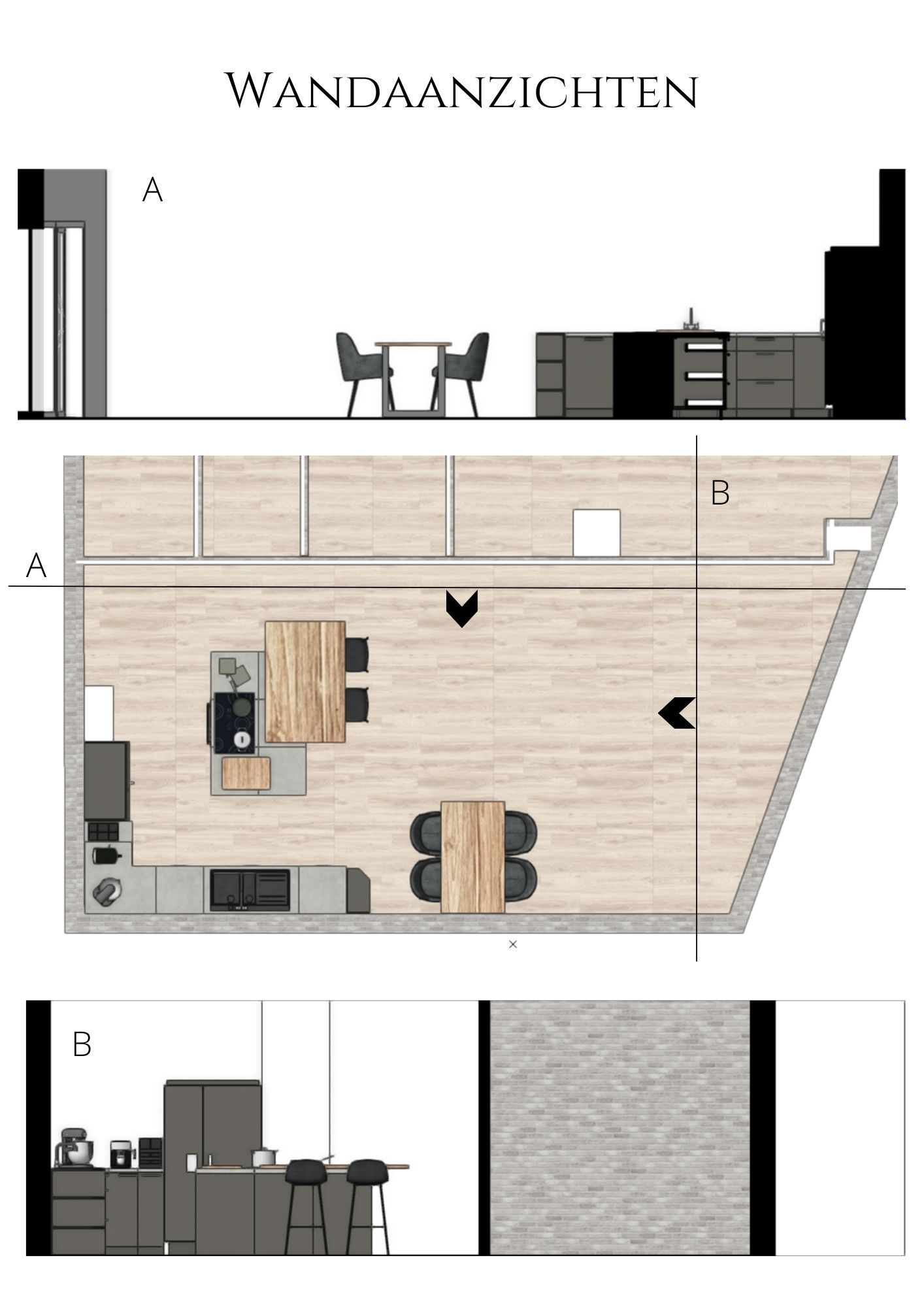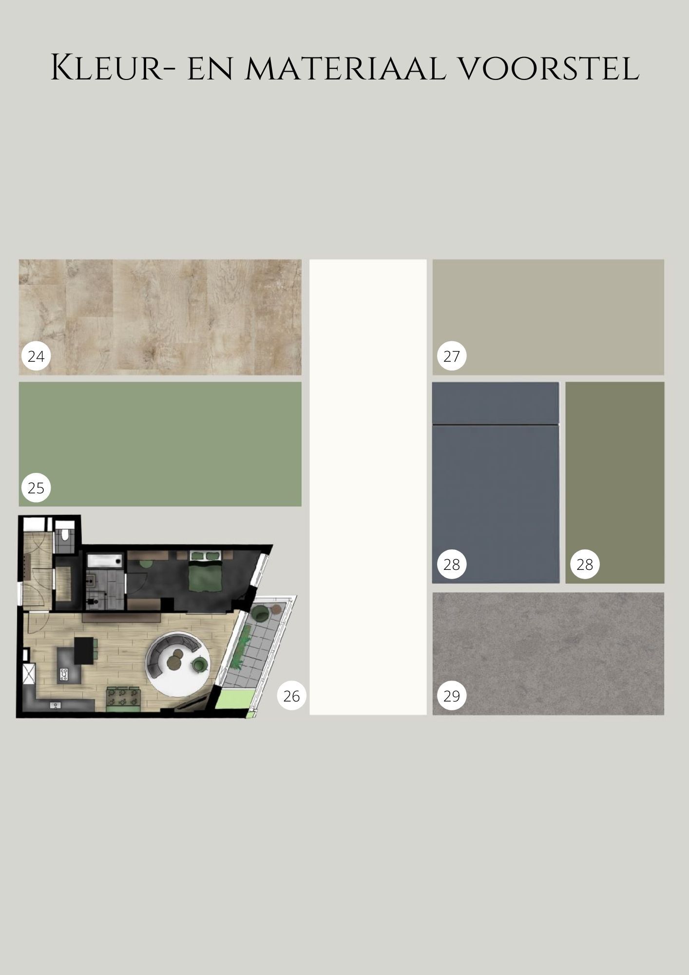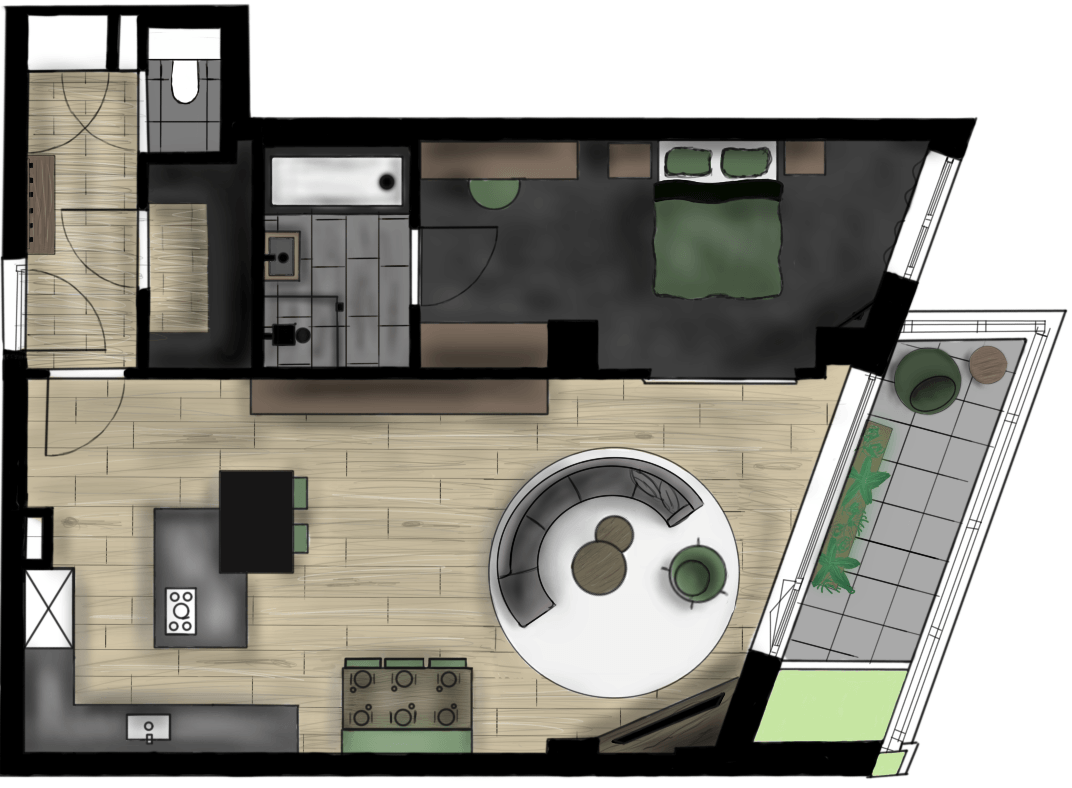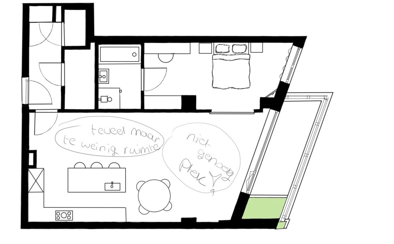 Tijdens dit project was het de bedoeling om een appartement in te richten voor iemand die hoogsensitief was. Hier moet dus goed rekening mee worden gehouden in het interieur, zachte texturen, minimalistisch en goede akoestiek. Ik heb hier gebruik gemaakt van een lichte basis in de vloer en daarop verder gebouwd met een strakke minimalistische keuken. Voor de rest heb ik gebruik gemaakt van natuurlijke kleuren en ronde vormen, wat je terug kan zien in het woongedeelte van de ruimte.