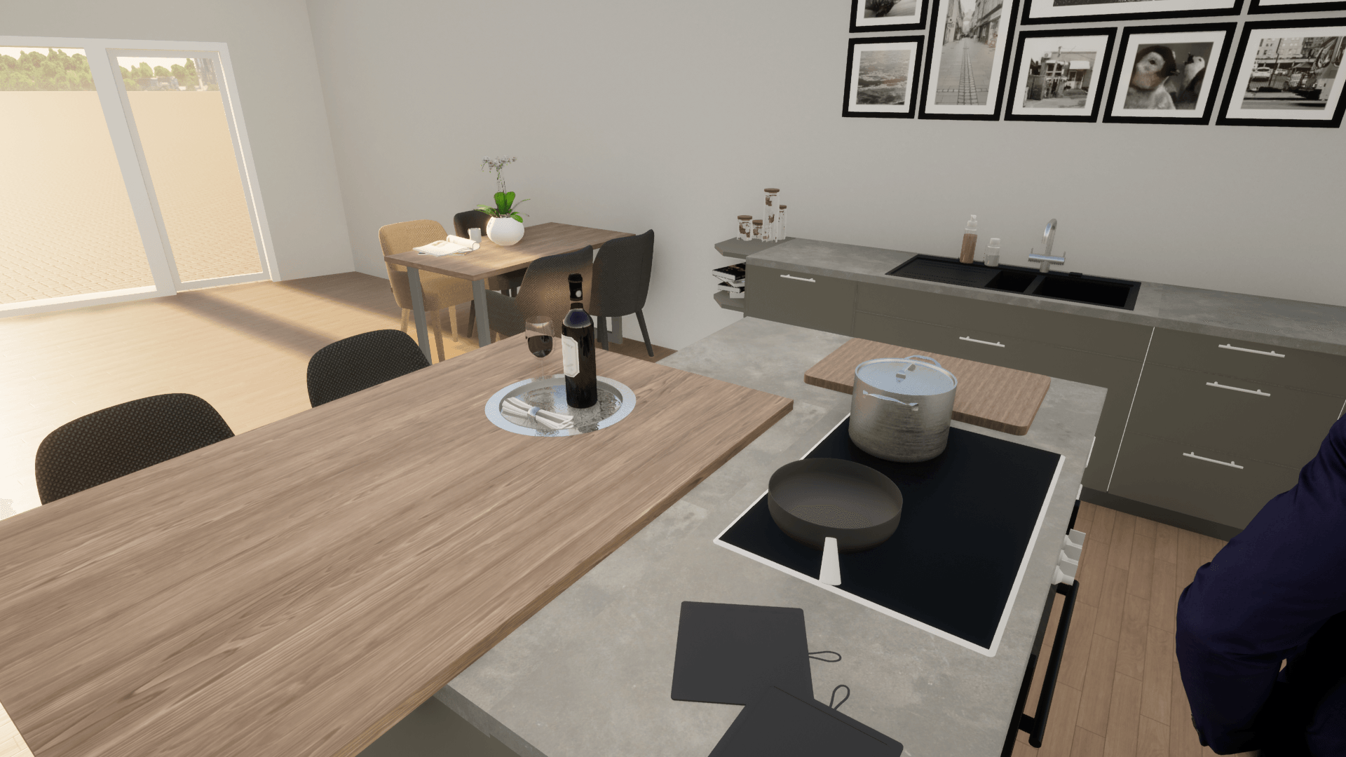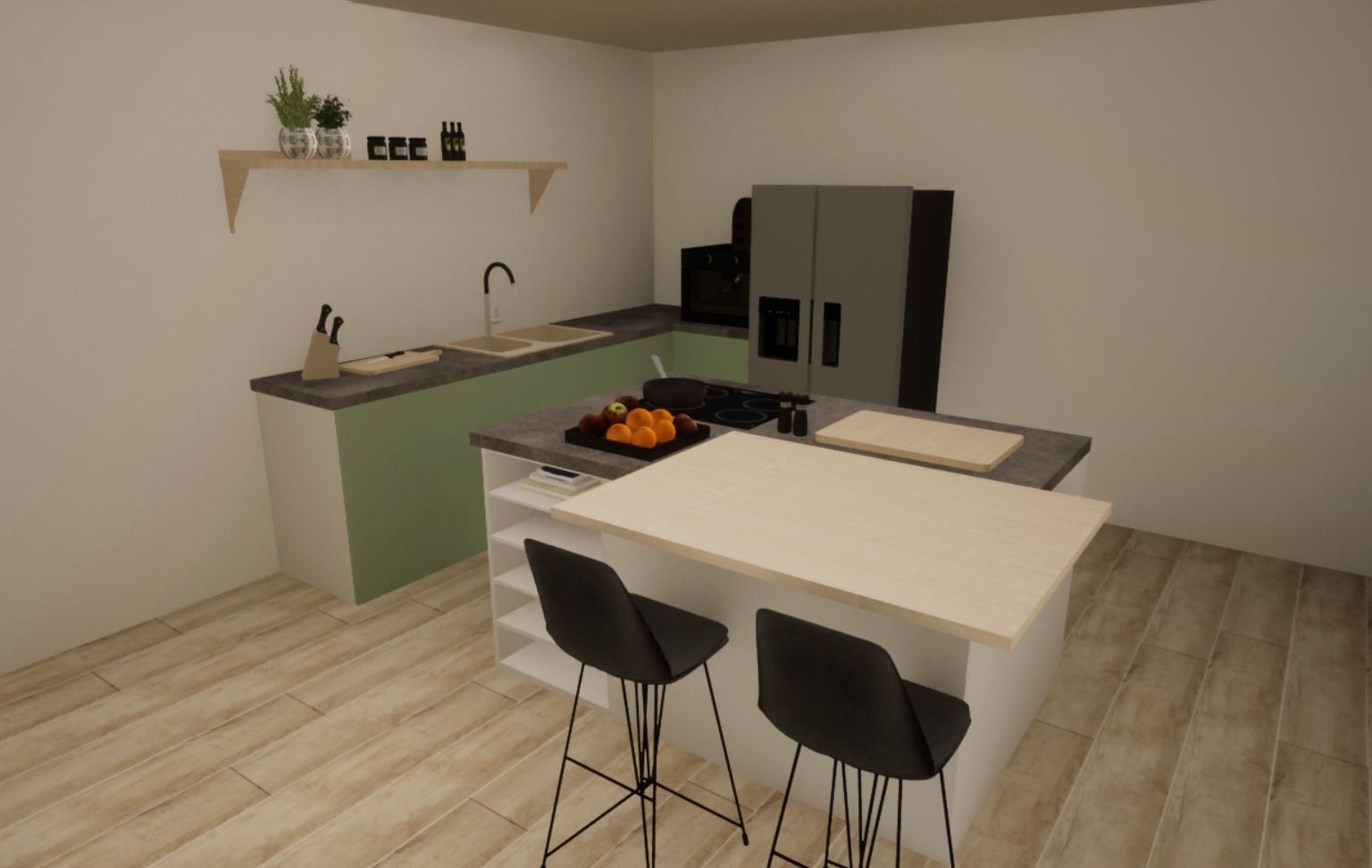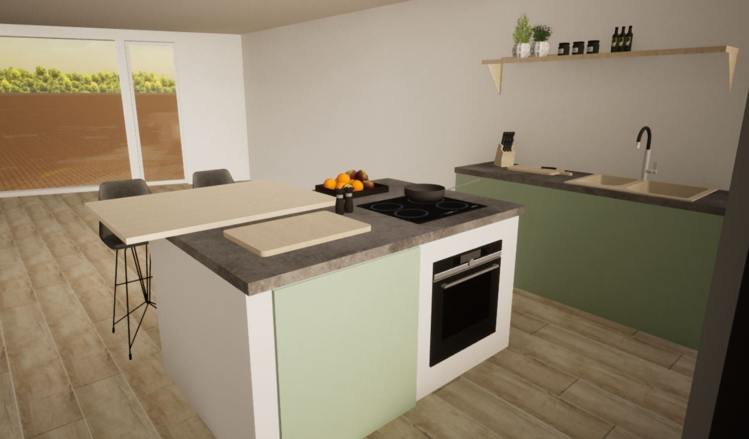 Tijdens dit project was het de bedoeling om een appartement in te richten voor iemand die hoogsensitief was. Hier moet dus goed rekening mee worden gehouden in het interieur, zachte texturen, minimalistisch en goede akoestiek. Ik heb hier gebruik gemaakt van een lichte basis in de vloer en daarop verder gebouwd met een strakke minimalistische keuken. Voor de rest heb ik gebruik gemaakt van natuurlijke kleuren en ronde vormen, wat je terug kan zien in het woongedeelte van de ruimte.